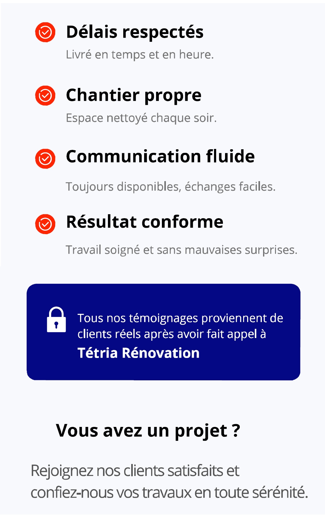 EXCELLENT Basée sur 18 avis Publié sur Hiva BouroubaTrustindex vérifie que la source originale de l'avis est Google. très pro je recommande 👍🏼👍🏼👍🏼Publié sur Idris HalilTrustindex vérifie que la source originale de l'avis est Google. Travaux réalisés avec beaucoup de sérieux et de rigueur. La communication a été excellente du début à la fin, les délais respectés et le résultat est de qualité. Une entreprise fiable et professionnelle que je recommande sans hésiter.Publié sur YanisTrustindex vérifie que la source originale de l'avis est Google. Entreprise très sérieuse et fiable. Les travaux ont été réalisés avec beaucoup de soin et de professionnalisme. Bonne organisation, respect des délais et résultat final de grande qualité. Très satisfait.Publié sur Rayan SaléTrustindex vérifie que la source originale de l'avis est Google. Très bonne expérience avec cette entreprise (électricité, isolation intérieure et extérieure, peinture et carrelage) . Travail soigné, communication fluide et respect des engagements annoncés. Un vrai sérieux, ce qui est rare dans le secteur de la rénovation. Recommandé à 100 %.Publié sur Majid BOUROUBATrustindex vérifie que la source originale de l'avis est Google. Excellente entreprise de rénovation. Travail de grande qualité, finitions soignées et chantier parfaitement organisé. Délais respectés, communication claire et équipe très professionnelle du début à la fin. Le résultat final est au-delà de mes attentes. Je recommande sans hésitation.Publié sur y PTrustindex vérifie que la source originale de l'avis est Google. Sérieux et efficaces ✊️Publié sur david germainTrustindex vérifie que la source originale de l'avis est Google. Satisfait de mes travaux de rénovation. Rapide et professionnelPublié sur Xavier CHARLETTrustindex vérifie que la source originale de l'avis est Google. Bonne entreprise qui a su s'adapter à notre chantier pas évident suite à un dégâts des eauxCertifié par: TrustindexLe badge vérifié de Trustindex est le symbole universel de confiance. Seules les meilleures entreprises peuvent obtenir le badge vérifié, avec une note supérieure à 4.5, basée sur les avis des clients au cours des derniers 12 mois. En savoir plus